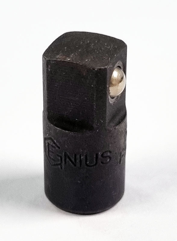 Black impact socket adapter converts 1/4" drive to 3/8" drive.