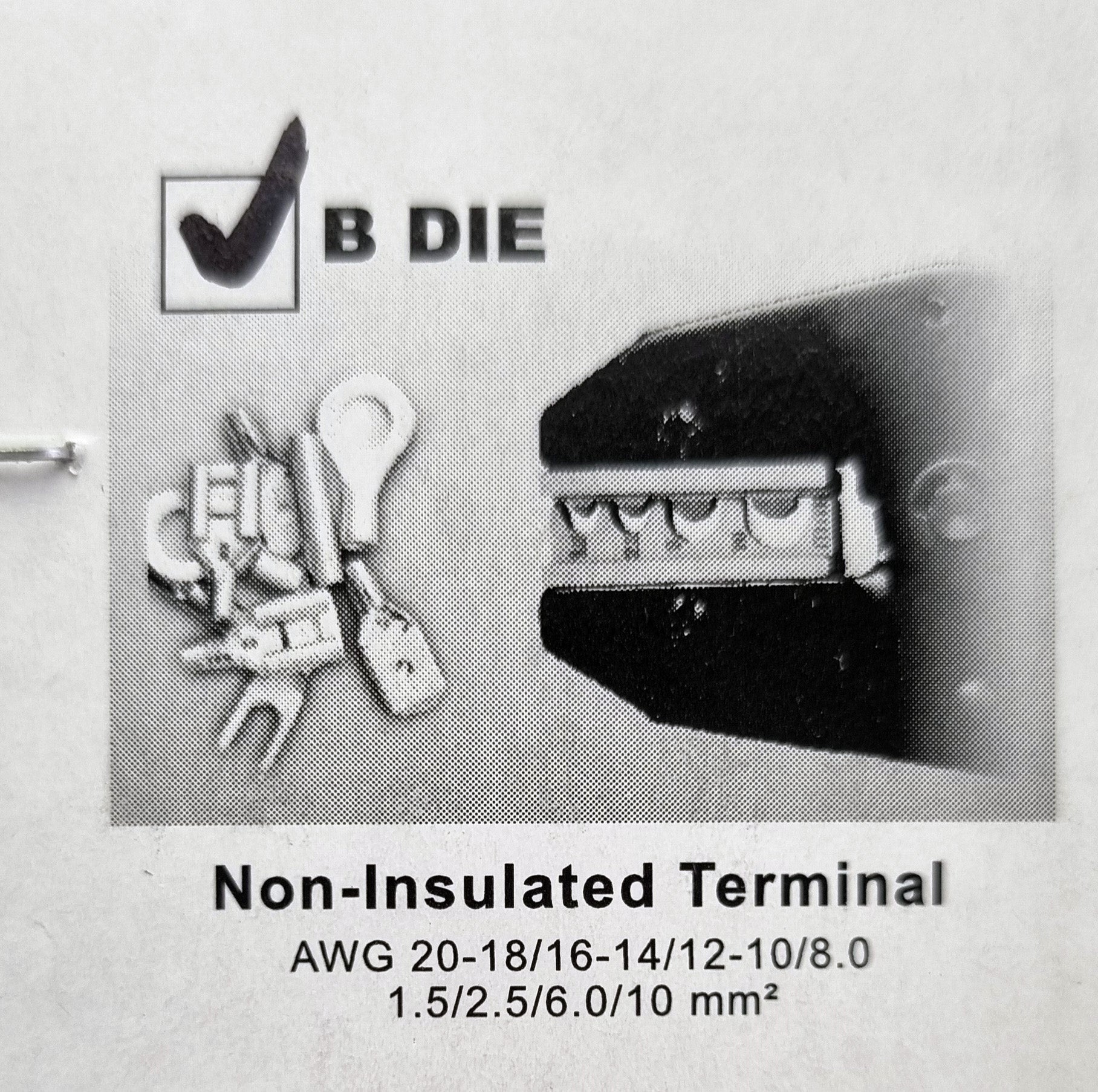 These come with the B Die jaws. (AWG 20-18/16-14/12-10/8.0-1.5/2.5/6.0/10mm2). See images for more information.